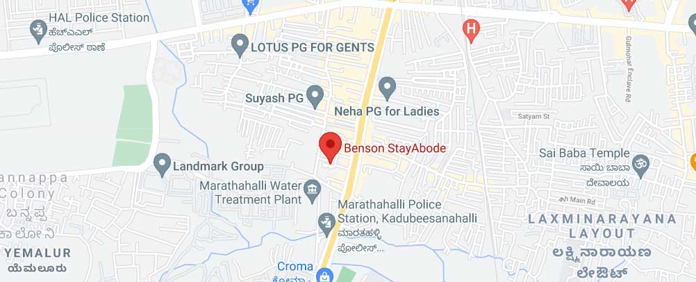 This beautifully designed property called Benson StayAbode in Bangalore is one of the best living spaces in the city. It is located opposite the SBR Building on the Marathahalli Outer Ring Road. It is surrounded by restaurants such as KFC, Absolute Barbecue, and many more. There is a Fastrack watch shop, ICICI Bank, VIMS Hospital, World Wide Church in the immediate vicinity. This co-living property has shared single and double rooms at an affordable price. All modern amenities are included in the monthly rent. DTH, water supply, Wi-Fi, housekeeping, etc. Daily cleaning and sanitation are also handled by trained staff. For more details, please visit. We would love to have you here!