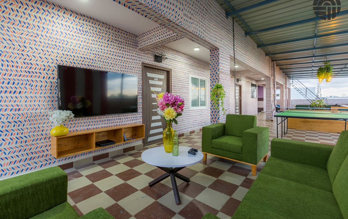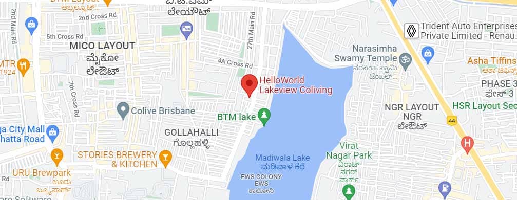 HelloWorld Lakeview is a new property in BTM 2nd Stage in the city of Bangalore. It offers private and double shared rooms with facilities such as a cloakroom, security, dartboard area, PlayStation, library, sofa, roof garden, table tennis, RO drinking water, simply shared kitchen, monopoly, shared dining room, coffee table, coffee, hammock, board games, dartboard, microwave, washing machine and more. Schools like Vibgyor Secondary School, Vidya Jyothi Primary and Secondary School, major markets like Home needs Supermarket, Ashirwad Supermarket, establishments like Marigold Hospital, Sakhi Hospital, and Rashtriya Vidyalaya Road Metro Station are all in close proximity.