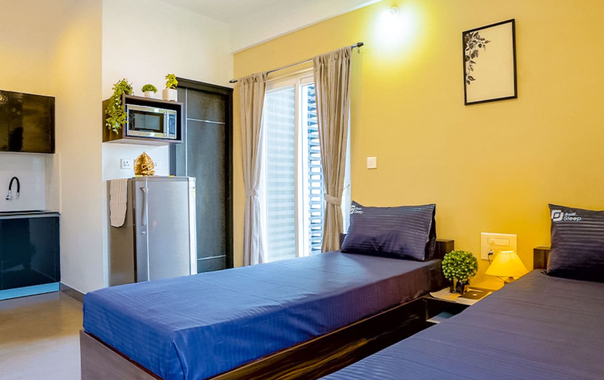 Settl Santorini is one of the most elegant and modern places to live. It is located above the Khatabook office in the Indiranagar. It consists of fully furnished and well-equipped private rooms with TV, WiFi, desk, air conditioning, attached bathroom, etc. Key amenities such as cleaning service, high security, geyser, washing machine, induction, fridge, modular kitchen, stylish decor, modern interior, backup power, electricity supply, and much more. The environment is very safe, clean, and full of greenery. It has perfect connections to the train station and the airport. Experience community living with like-minded people in this beautifully landscaped coliving estate.
